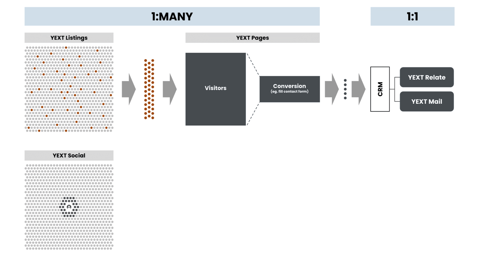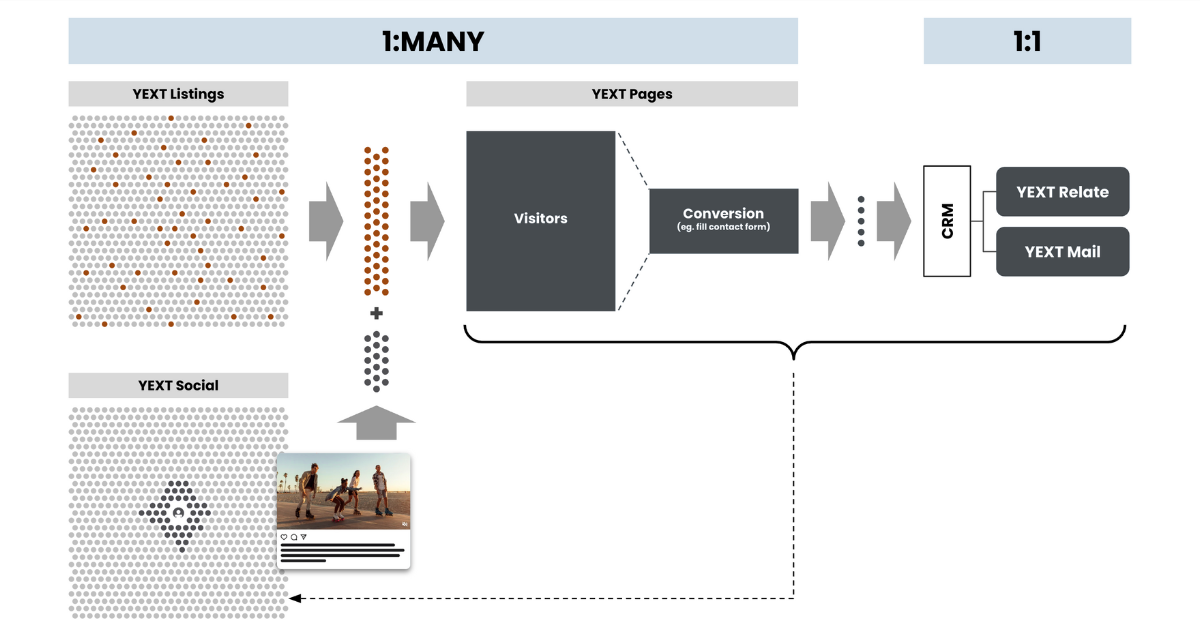 Based on the findings, the journey begins with a potential customer discovering a client’s business through Yext Listings, and decide to visit a website (Yext Pages product). Once a conversion occurs (eg. filling a contact form) the lead information is immediately pushed to an integrated CRM. This triggers a personalized 1:1 interaction through Yext Relate or Yext Mail, allowing the client to follow up instantly and begin building a personal relationship.