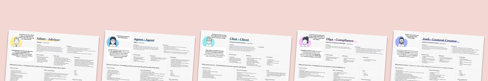 I facilitated workshops to define five key proto-personas based on user roles: Agnes (Agent), Adam (Advisor), Clint (Client), Olga (Compliance), and Josh (Content Creator). To validate these, we held a design critique session where stakeholders reviewed the personas and marked points as Important, Misleading, Incorrect, or Missing data. This ensured our personas were accurate and comprehensive.